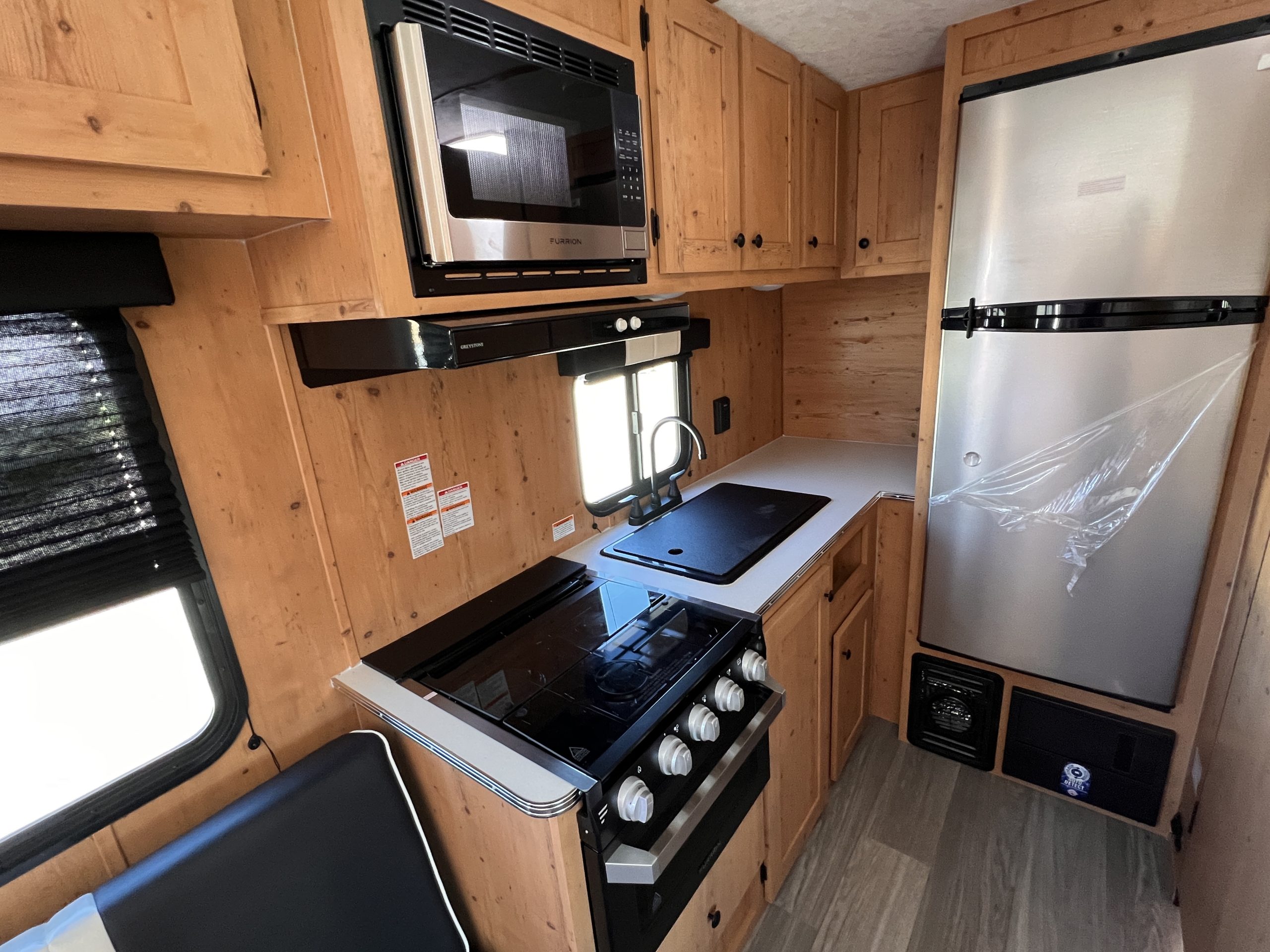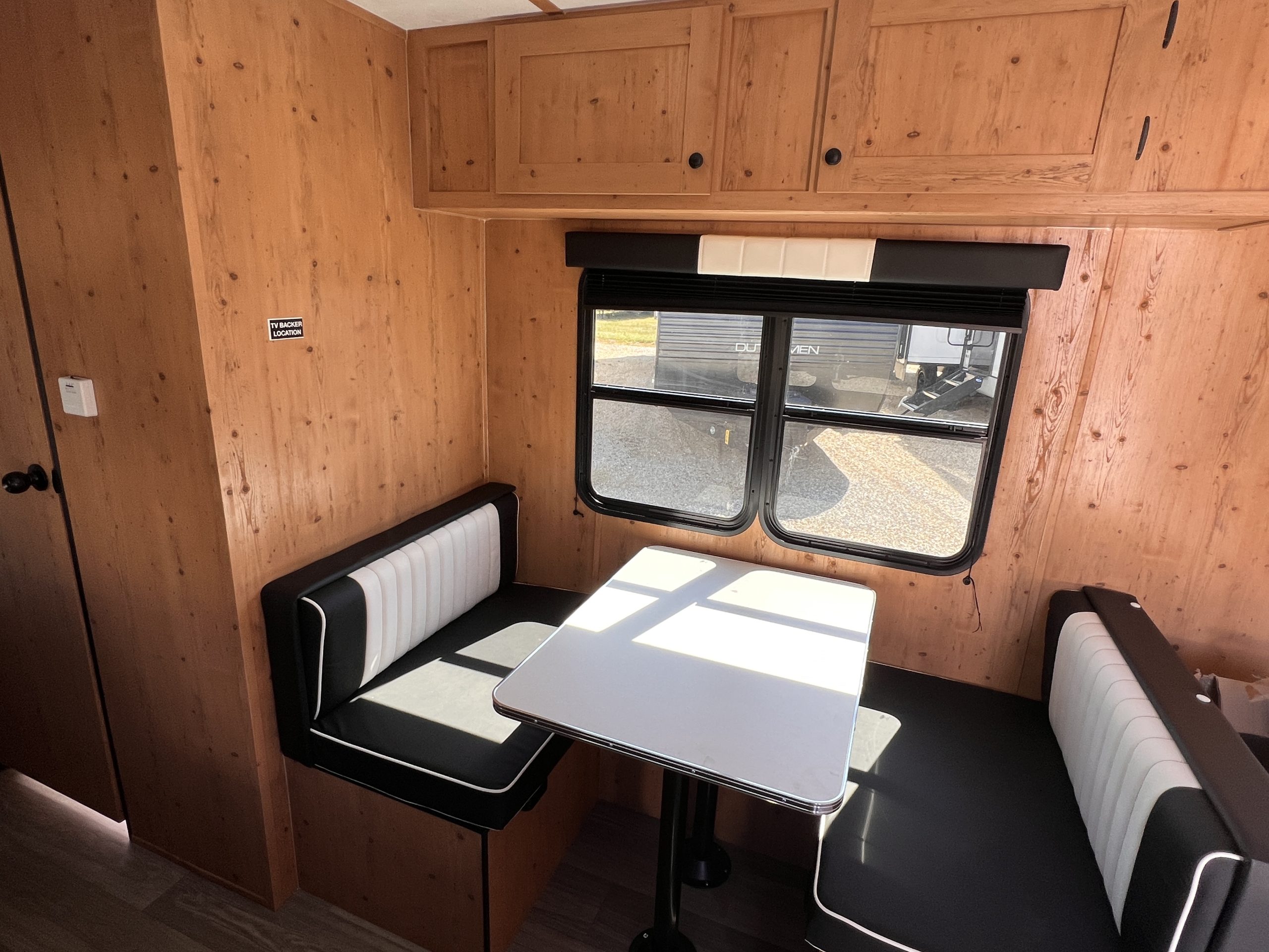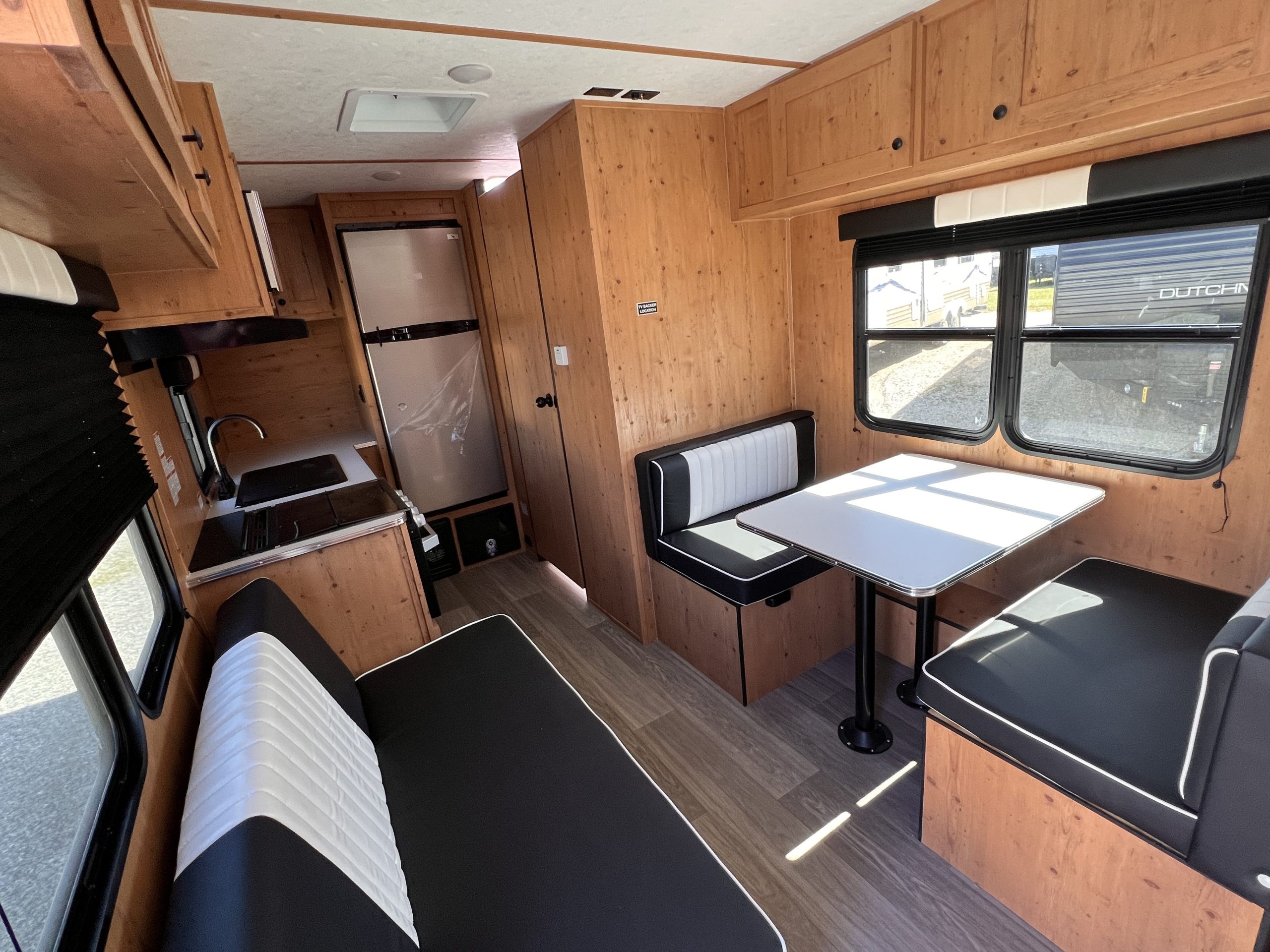 This Retro 186 is a nice small unit at only 2,480 pounds dry weight. There are interior and exterior trim to make the "retro look". Inside the camper there is a bed in the front, with drawers under for storage. There is a dinette and sofa that will convert into sleeping. It has a full inside kitchen with sink, stove/oven, refrigerator, and microwave. The camper also has furnace & A/C. There is a roof mounted solar panel to charge the battery.